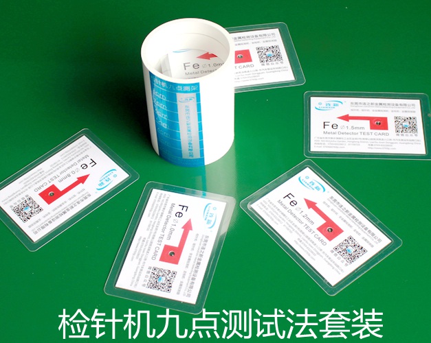經過上邊三個測試方法都能檢測到測試卡并報警停機倒退的,此檢針機械可以正常使用。(檢針機靈敏度即所使用的標準測試卡直徑,現在多采用直徑為0.8/1.0/1.2/1.5/2.0mm的鐵球測試卡。實際檢針靈敏度要采用那種型號的測試卡,要視具體檢測的產品和出口國標準及檢針機械的通道高度等因素來決定)。以上檢針機靈敏度校驗需每三小時進行一次,并將校驗結果書面記錄下來,以供應客戶查驗。