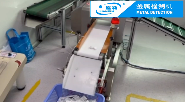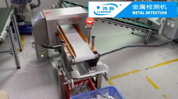 翻板剔除型金檢機加裝斜坡提升機,可對接包裝機,檢測到金屬后翻板自動剔除不合格產品。