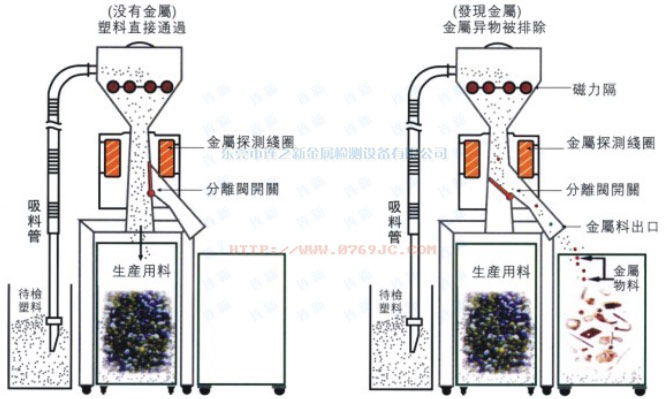 1、專為粉末狀及顆粒狀產品設計的在線檢測裝置,由管道自由下落通道及探測器和排除裝置完美結合組成。具有高靈敏度與高抗干擾能力。