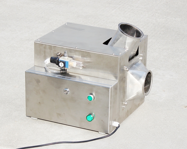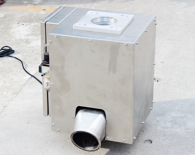 原料從料斗或送料器自由下落進入金屬分離器,如果沒有金屬雜質,原料會直接通過金屬分離器流向下端的出料口。如果檢測器檢測到原料中含有金屬,那么控制器立刻啟動分離板將金屬物和部分原料一起導向側面的排料口,然后分流板迅速恢復至正常的位置,分流板速度可調,金屬分離器的檢測精度也可根據生產需要調節,最小可檢測并分離出Φ 0.2mm的金屬顆粒。
